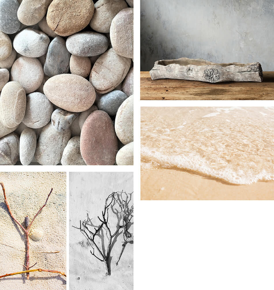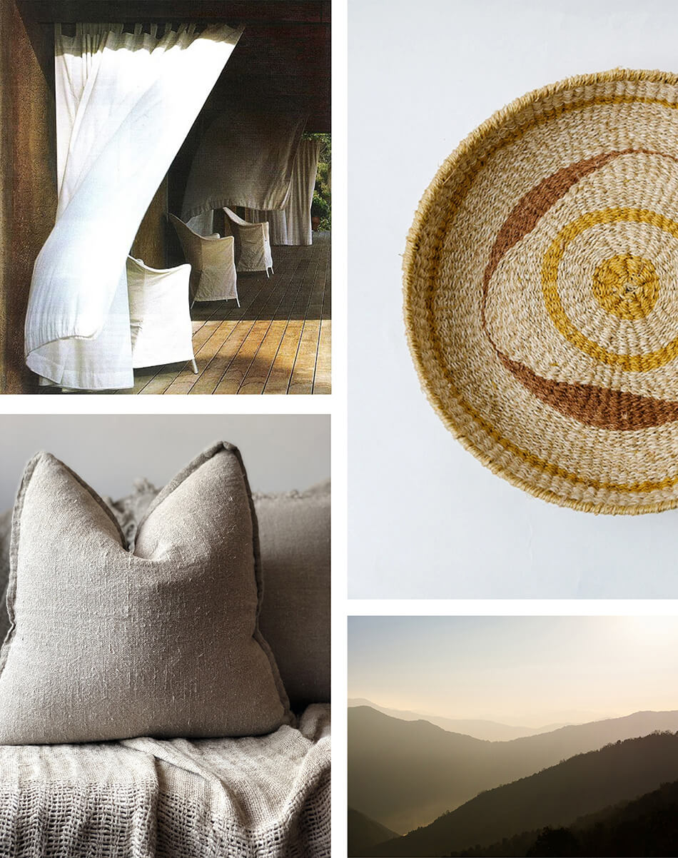 top left to bottom right: 1. soft linen natural raw tones of a sweet retreat in the moutains 2. pamper tracing maps Litoral woven basket #0226 3. linenandlavender.net 4. Nepal mountains clairestelleprintshop 5. The smooth feel and natural soothing tones of river stones 6. a beautiful drift wooden centrepiece www.arhaus.com 7. found objects on a beach in byron bay 8. the waters edge purifies my soul
